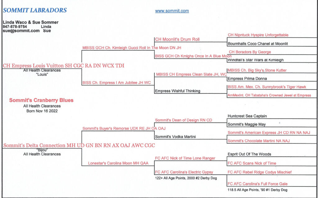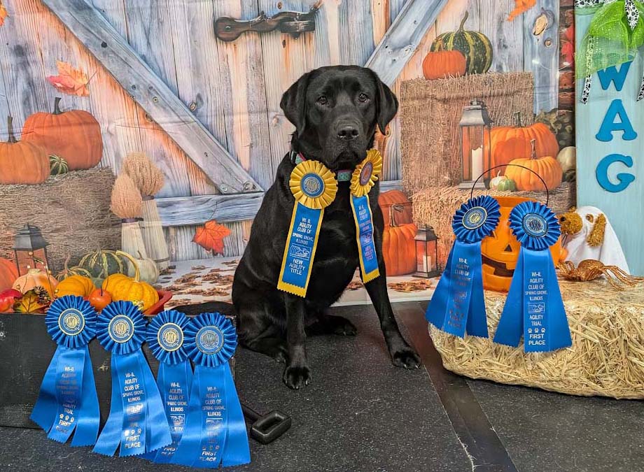 Craisin is the daughter of our wonderful Bijou and her sire, Louie, was not only a very handsome champion but also a talented field and performance competitor. She has become the excellent working girl that we hoped for and has enjoyed every sport that she’s encountered. Craisin has a perfect Labrador temperament and loves every human and dog that she meets! She is currently competing in Open obedience and Agility and hopes to achieve those titles in the fall of 2025. Craisin easily earned her AKC Junior Hunter title at 1 year of age and her Senior Hunter title at 2 years of age handled by Lauren Springer of Dynamic Retrievers. We expect her to achieve her Master Hunter title in 2026!